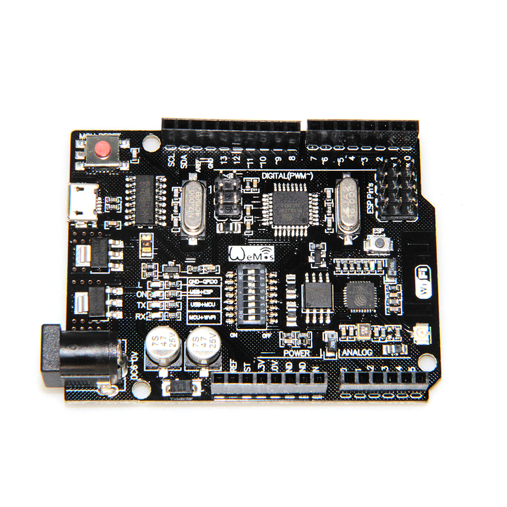 Представляет собой плату выполненную в форм-факторе Arduino UNO и включающей в себя микроконтроллер ATmega328P и чип WiFi ESP8266 с флэш-памятью 8 МБит. Это позволяет использовать плату как класическую Arduino UNO, а при необходимости использовать весь потенциал платы с модуль WIFI и памятью. Распиновка выполнена по класcической схеме Arduino UNO. Для подключения к ПК необходимо установить USB драйвер для CH340. Периферия MCU: Atmega328; Wi-Fi MCU: ESP8266 + 8 Мb flash; USB: TTL CH340G;