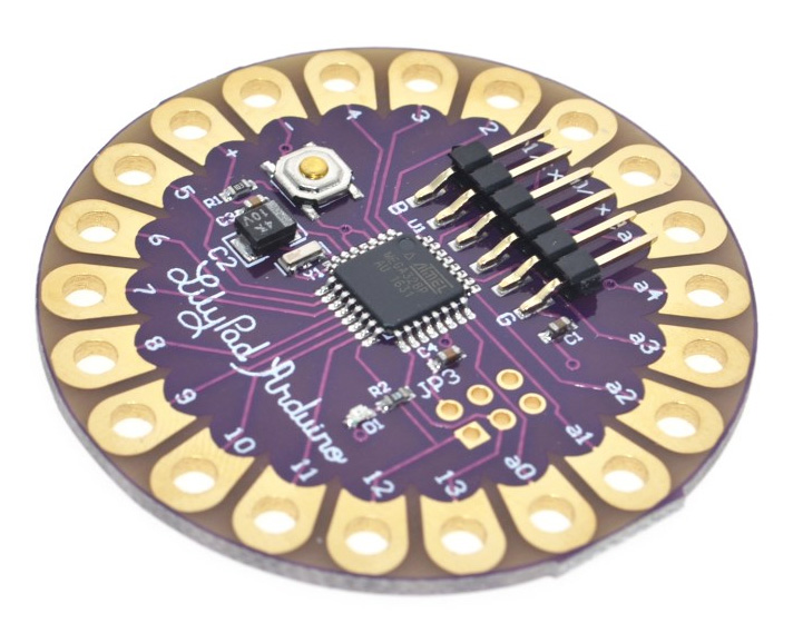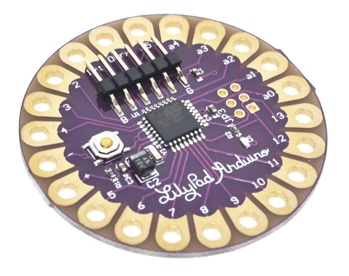 Основу платы составляет микроконтроллер ATmega328P с частотой 16 МГц, 32 Кб программной и 2 Кб оперативной памяти, а также 1 Кб энергонезависимой памяти данных. Для подключения различных модулей к плате следует использовать специальные токопроводящие нити. Одежду с LilyPad можно стирать вручную либо в стиральной машинке при щадящем режиме. Компонентов на плате – необходимый минимум. Всего выводов – 22, из них 2 используются для подачи питания. Так же, как и Arduino UNO, LilyPad имеет 14 (6 поддерживают ШИМ) цифровых пинов и 6 аналоговых. Также на плате присутствует шестипиновая колодка для последовательного порта. С его помощью осуществляется программирование и связь с компьютером. Для удобства LilyPad содержит встроенный светодиод и кнопку сброса. Стабилизатора напряжения на плате нет, поэтому входное напряжение должно лежать в пределах 2,7 – 5,5 В