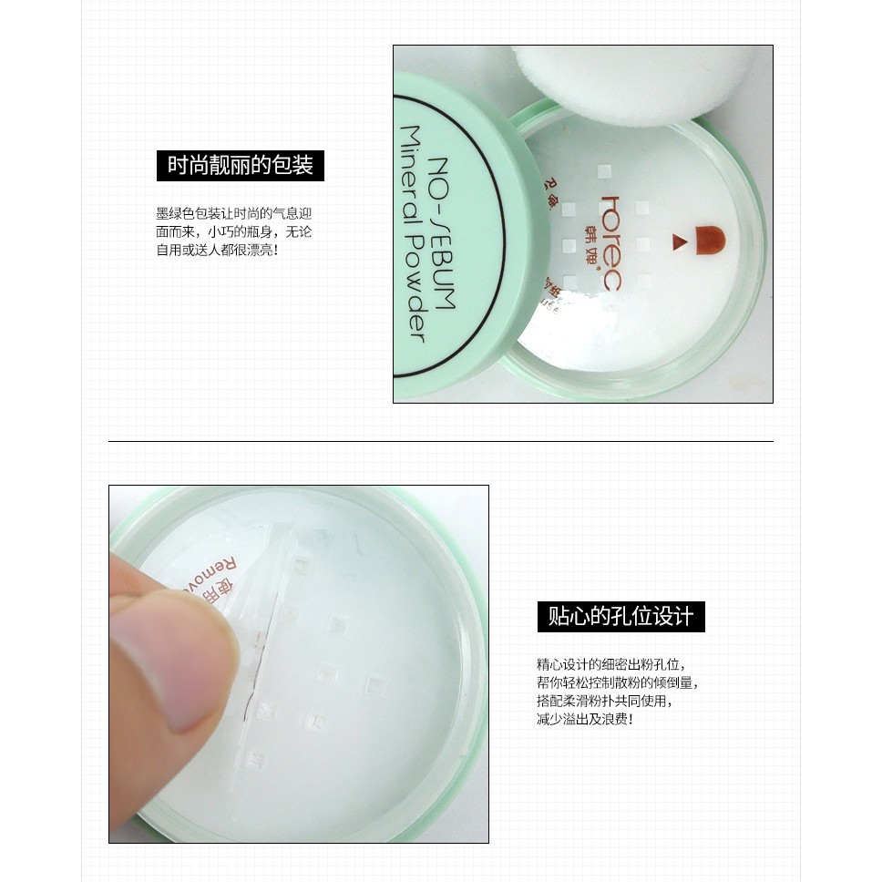 Минеральная пудра No-Sebum Рассыпчатая пудра - это пудра с очень мелким помолом, в отличие от компактной. Благодаря невесомости своих компонентов минеральная пудра позволяет создавать легкий макияж. Покрытие с помощью данной пудры получается ровным и максимально натуральным. Более того минеральную пудру Rorec можно использовать как фиксатор для макияжа, под слоем пудры макияж не скатается и не потечет Состав: экстракт мяты, слюдяной порошок Метод использования: нанесите пудру на слой тонирующего средства с помощью пуховки или кисточки для пудры. Хранить с плотно закрытой крышкой в сухом темном месте. беречь от детей. не использовать после истечения срока годности. ООО «Европейская косметика», г. Гуанчжоу Адрес: г. Гуанчжоу, Байюньский район, пригород Жэньхэ, Деревня Дасян, Седьмой экономический кооператив (девятое деление), улица Бэй, здание № 2. Лицензия на производство косметики: Провинция Гуандун, косметика 20160694 Действующий стандарт: GB/T20680 Номер партии и срок годности продукции: указан на упаковке Произведено: г. Гуанчжоу, Китай.