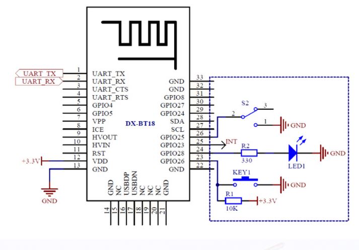 DX-BT18 двух-режимный модуль Bluetooth, специально разработан для смарт беспроводной передачи данных и соответствует стандарту Bluetooth 4.2 Модуль DX-BT18 применяется для беспроводной передачи данных используя чип BT4.2 и PCB антенну на плате, SoC чипа поддерживает набор необходимых протоколов для двух-режимной работы, поддерживает передачу данных Windows, Linux, Android, iOS и другие системы. Выполнен модуль с учетом требований в промышленности: достаточная дальность и стабильность работы, простота настройки и подключени Общий Пин: 1> .UART_TX: вывод данных UART 2> .UART_RX: ввод данных UART 3> .VCC: входной источник питания 4> .GND: входной источник питания 5> .GPIO26: Разъединить контакт (200 мс, отключение импульсов малой мощности) 6> .GPIO28: светодиодный индикатор (не подключен, мигает, подключение всегда включено) 7> .GPIO23: порт индикатора подключения Bluetooth (не подключен низко, подключен высоко) 8> .GPIO25: Контакт переключения AT-команд (режим AT-команд низкого уровня)