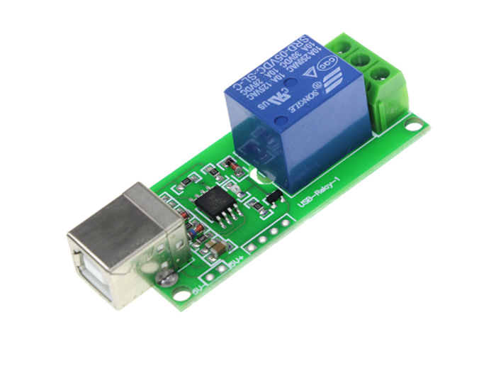 Одноканальное USB реле рассчитано на напряжение до 250В и силу тока до 10А (до 2,5 кВт мощности). При коммутации постоянного тока, напряжение не должно превышать 30 В. Плата содержит электромеханическое реле с гальванической развязкой и микросхему управления. USB реле подключается к компьютеру через разъём USB 2.0 типа «A».