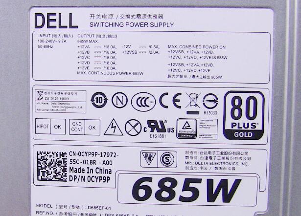 Серверный блок питания Dell Precision T5610 685W Psu CYP9P Особенности: Совместимый настольный компьютер Dell: Precision T5610, 5810 Номер по каталогу Dell: CYP9P, 0CYP9P, CN-0CYP9P Номер детали: CYP9P Вход: 100-240 В ~ 9,7A 50/60 Гц Выход: 12,0 VA 18.0A 12.0VB 18.0A 12.0VC 18.0A 12.0VD 18.0A 12.0VE 18.0A 12.0V 0.5A 12.0Vsb 2.0A Общая мощность : 685 Вт
