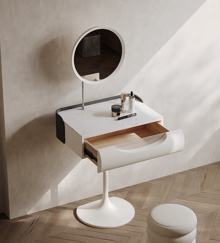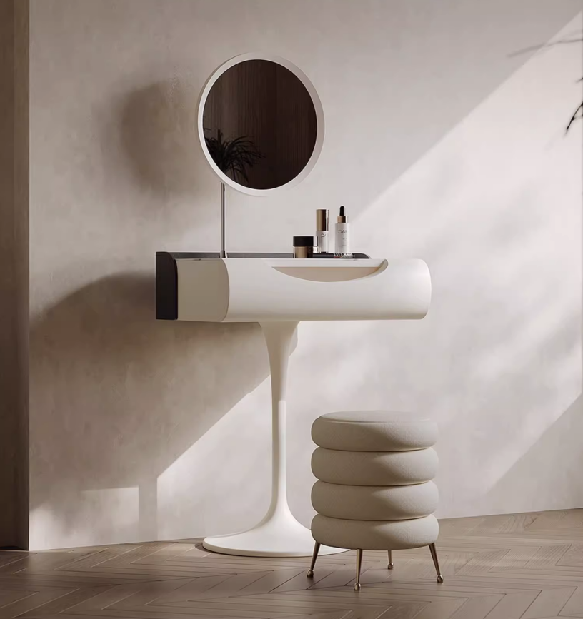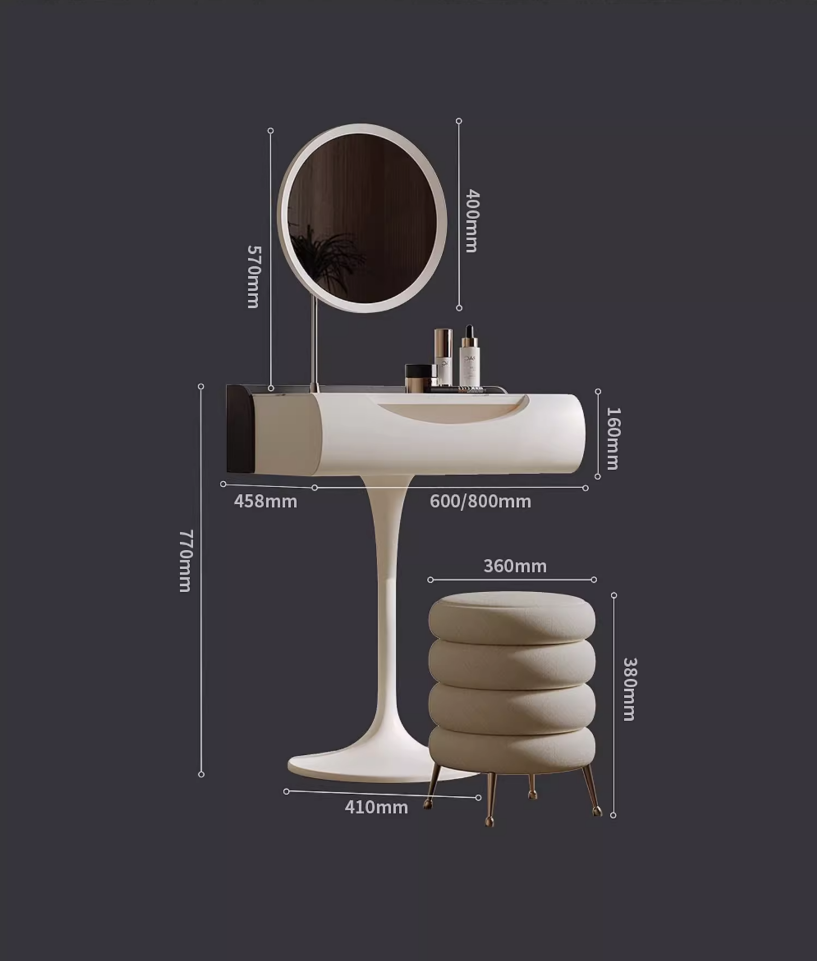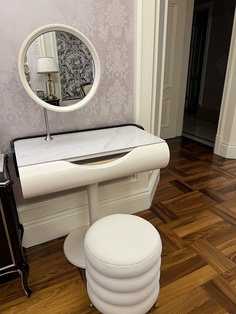 Откройте для себя совершенство минимализма с нашим дизайнерским туалетным столом в нежном сливочном оттенке. Изготовленный из массива дерева, он сочетает прочность и природную красоту натуральных материалов, создавая атмосферу уюта и изящества в вашем доме. Компактные размеры 80×77×45,8 см сделают эту мебель идеальным решением как для просторных, так и для уютных интерьерных композиций. Стол оснащён одним эргономичным ящиком, позволяющим аккуратно хранить косметику и аксессуары, а изящное зеркало отражает утреннее солнце, наполняя пространство светом и теплом. Плавные линии и единственная ножка придают изделию лёгкость и визуальную воздушность, подчёркивая особый дизайнерский подход. В комплект входит удобный пуф, который приглашает расслабиться и насладиться заботой о себе в комфортной обстановке. Этот туалетный стол — идеальный выбор для тех, кто ценит стиль, качество и практичность. Добавьте нотку натурального шика в интерьер и создайте своё пространство красоты и гармонии. Закажите сейчас и преобразите интерьер легко и со вкусом. Если остались вопросы — напишите нам в чат. Мы всегда на связи и с удовольствием поможем разобраться во всех нюансах.