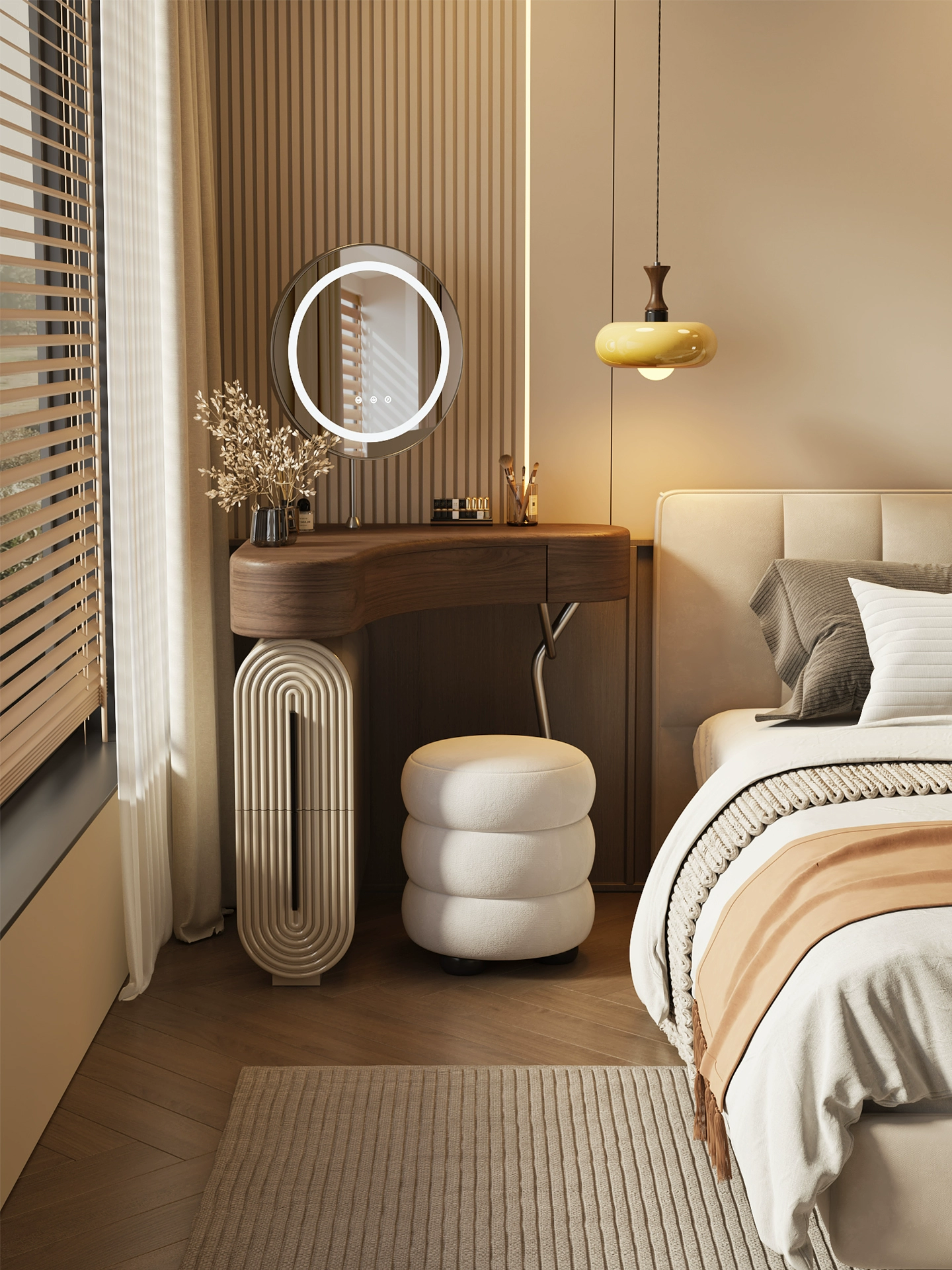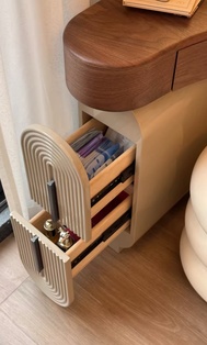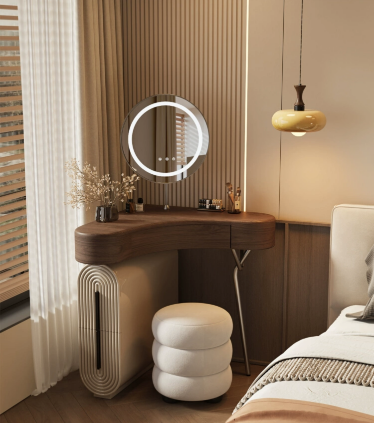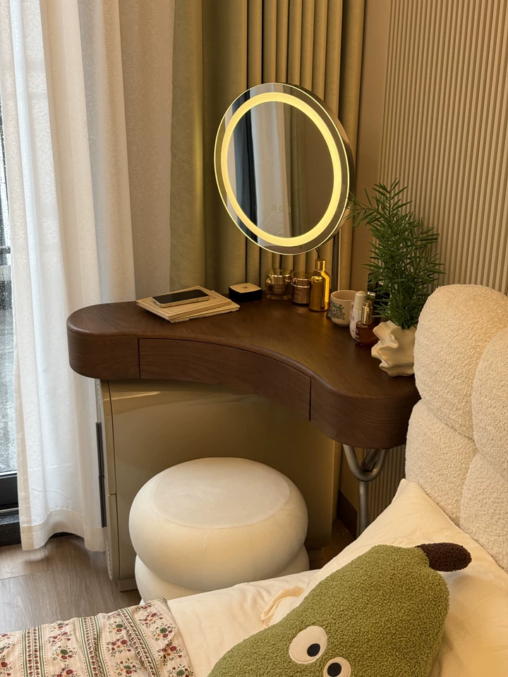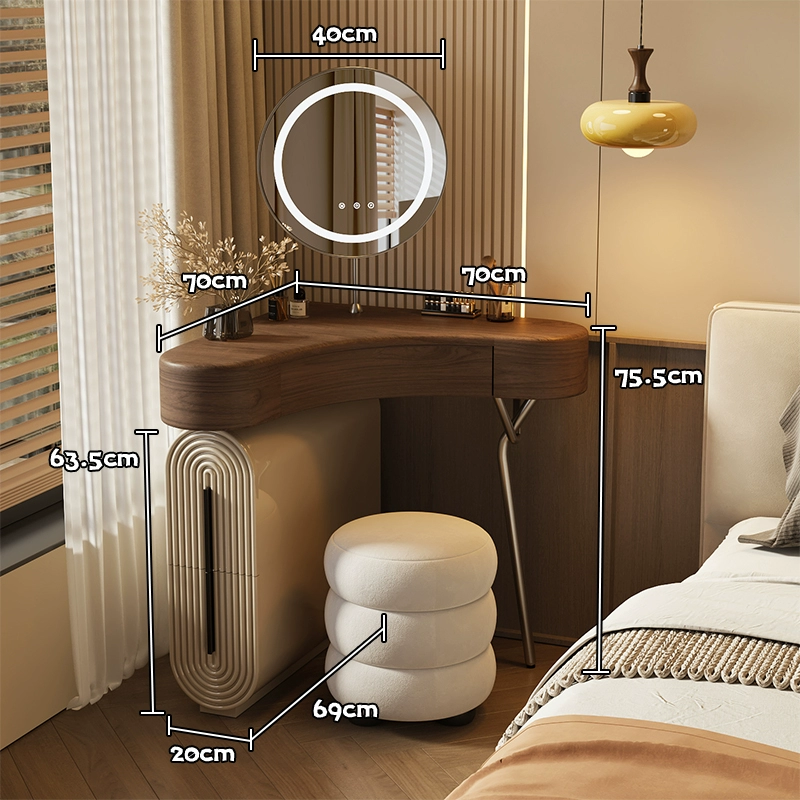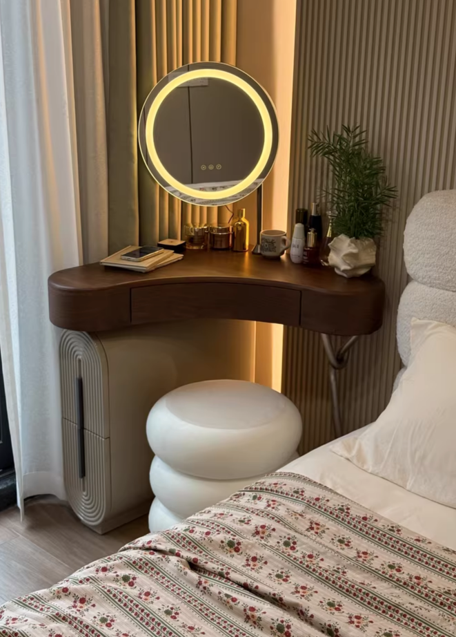 Дизайнерский туалетный столик с зеркалом для себя - откройте идеальное сочетание современного дизайна и функциональности в нашем туалетном столике с зеркалом в тёплом ореховом оттенке. Компактные размеры 70×75,5×70 см, высота туалетного столика делают его универсальным решением для любого интерьера, а круглая зеркальная поверхность диаметром 40 см добавляет мягкости и уюта в пространство. Столешница из качественного дерева не только радует глаз натуральным рисунком, но и служит надёжной основой для вашей косметики и аксессуаров. Металлическое основание с одной ножкой придаёт конструкции легкость и визуальную воздушность, а практичный ящик и открытая полка обеспечивают достаточно места для хранения важных мелочей. В комплекте идёт стильный пуф, который гармонично дополняет образ, создавая полноценное место для утреннего ритуала красоты. Какой туалетный столик выбрать? - конечно который собирается легко — оно поставляется в разобранном виде, что удобно для доставки и размещения даже в небольших комнатах. Если этот туалетный столик с зеркалом купить - он станет изящным акцентом в вашей спальне или гардеробной, где каждая деталь важна. Почувствуйте баланс эстетики и удобства — добавьте его в корзину и начните преображать свой интерьер уже сегодня. Если остались вопросы — напишите нам в чат. Мы всегда на связи и с удовольствием поможем разобраться во всех нюансах.