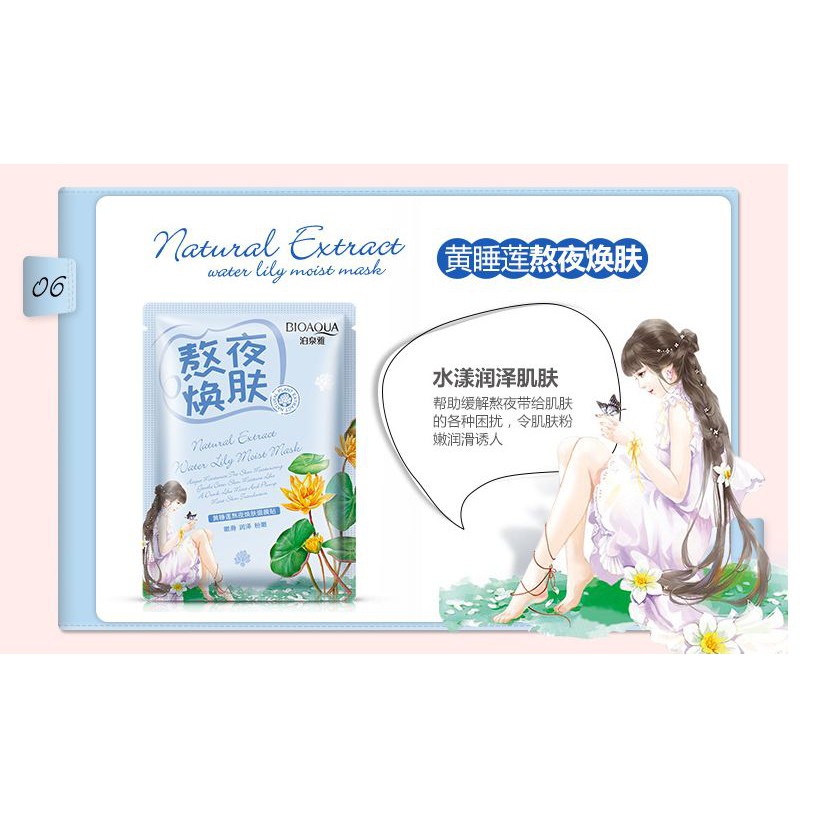 Увлажняющая маска BioAqua Natural Extract Увлажняющая маска BioAqua Natural Extract с экстрактом желтой кувшинки используется для увлажнения кожи на глубоком уровне. Наиболее эффективно устраняет признаки старения на зрелой коже, уменьшая глубину морщин и снимая воспаление. Natural Extract воспрепятствует преждевременной потере влаги, напитает кожу и преобразит ее. Основным компонентом маски является вытяжка из желтой кувшинки. К ее косметическим свойствам относится: 1. Антимикробное воздействие. 2. Глубокое увлажнение. Маска выполнена в виде салфетки из ткани, пропитанной природными косметическими вытяжками. По своей эффективности маска не уступает дорогим аналогам. Маска упакована в герметичную оболочку, что позволяет полностью сохранить полезные свойства пропитки. Метод использования: маску следует наносить только на очищенную кожу лица, держать в течении 20 минут, а после дать впитаться. При сильно пересушенной коже, после полного впитывания маски можно дополнительно нанести увлажняющий крем. ООО «Европейская косметика», г. Гуанчжоу Адрес: г. Гуанчжоу, Байюньский район, пригород Жэньхэ, Деревня Дасян, Седьмой экономический кооператив (девятое деление), улица Бэй, здание № 2. Лицензия на производство косметики: Провинция Гуандун, косметика 20160694 Действующий стандарт: GB/T2660 Номер партии и срок годности продукции: указан на упаковке Произведено: г. Гуанчжоу, Китай.